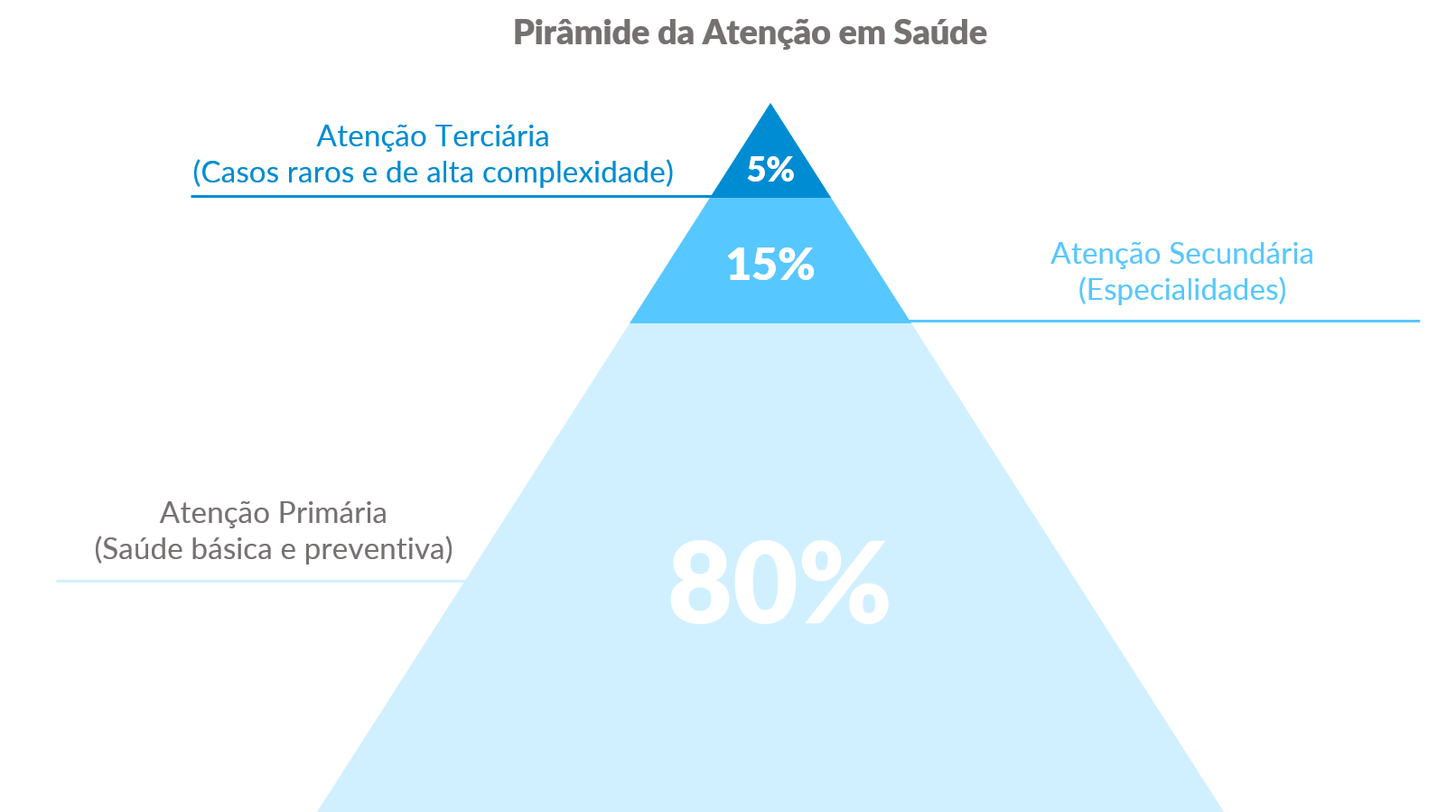 Imaginem uma pirâmide. Na sua base temos a Atenção Primária à Saúde, onde são resolvidos cerca de 80% de todos os problemas de saúde, e acima temos os níveis secundário e terciário, que envolvem os procedimentos de maior complexidade, sendo responsáveis por atender cerca de 20% dos problemas de saúde da população.